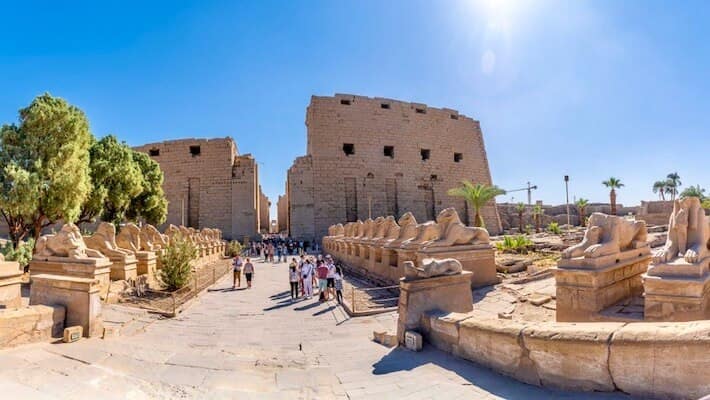 Karnak Temple in Luxor with its majestic avenue of Ram-headed sphinxes.