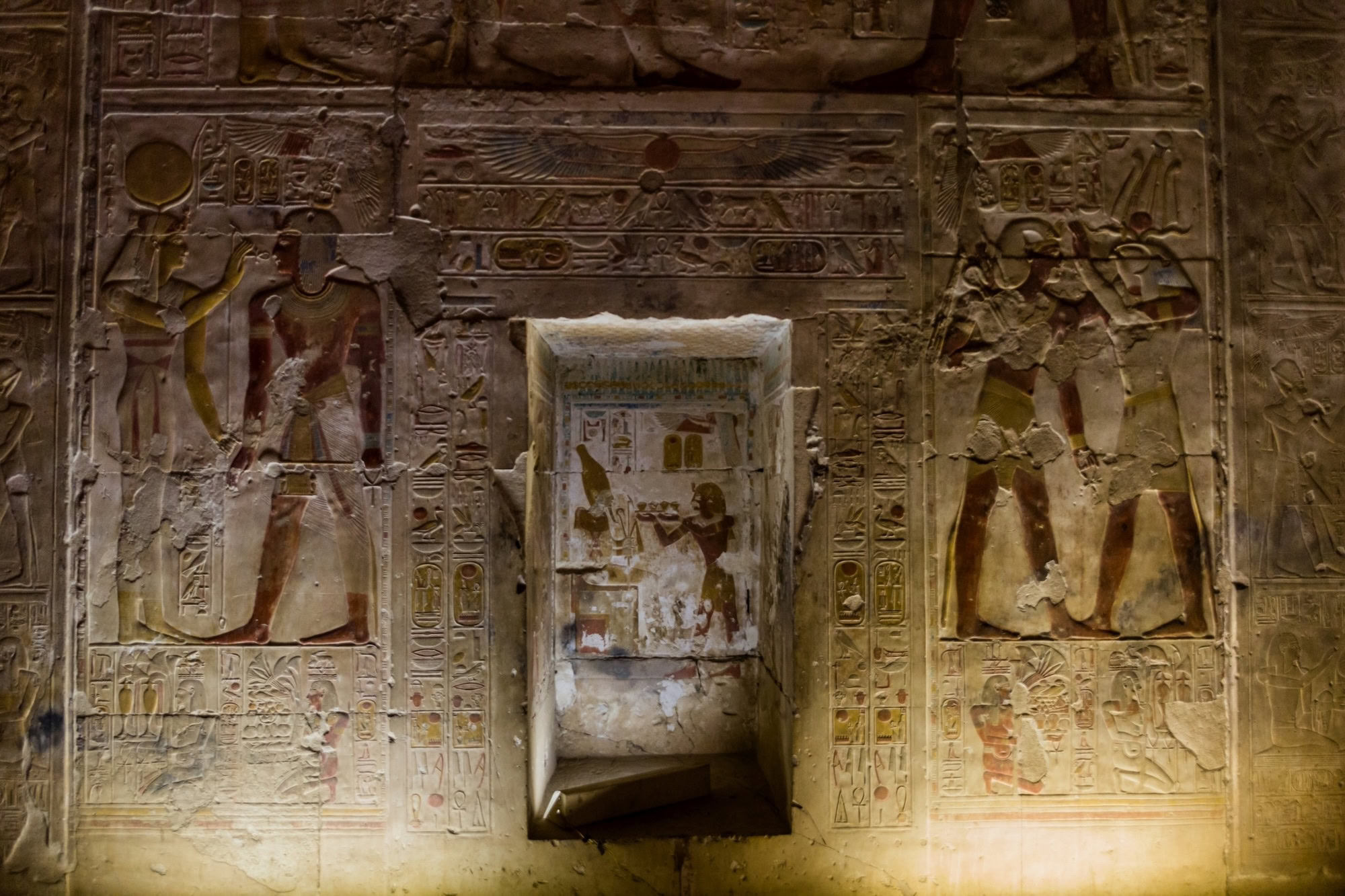 When Deir El Hagar Temple was first discovered, some of it had fallen down. The entry court, which is made from mud brick, had collapsed, and the columns had fallen in.