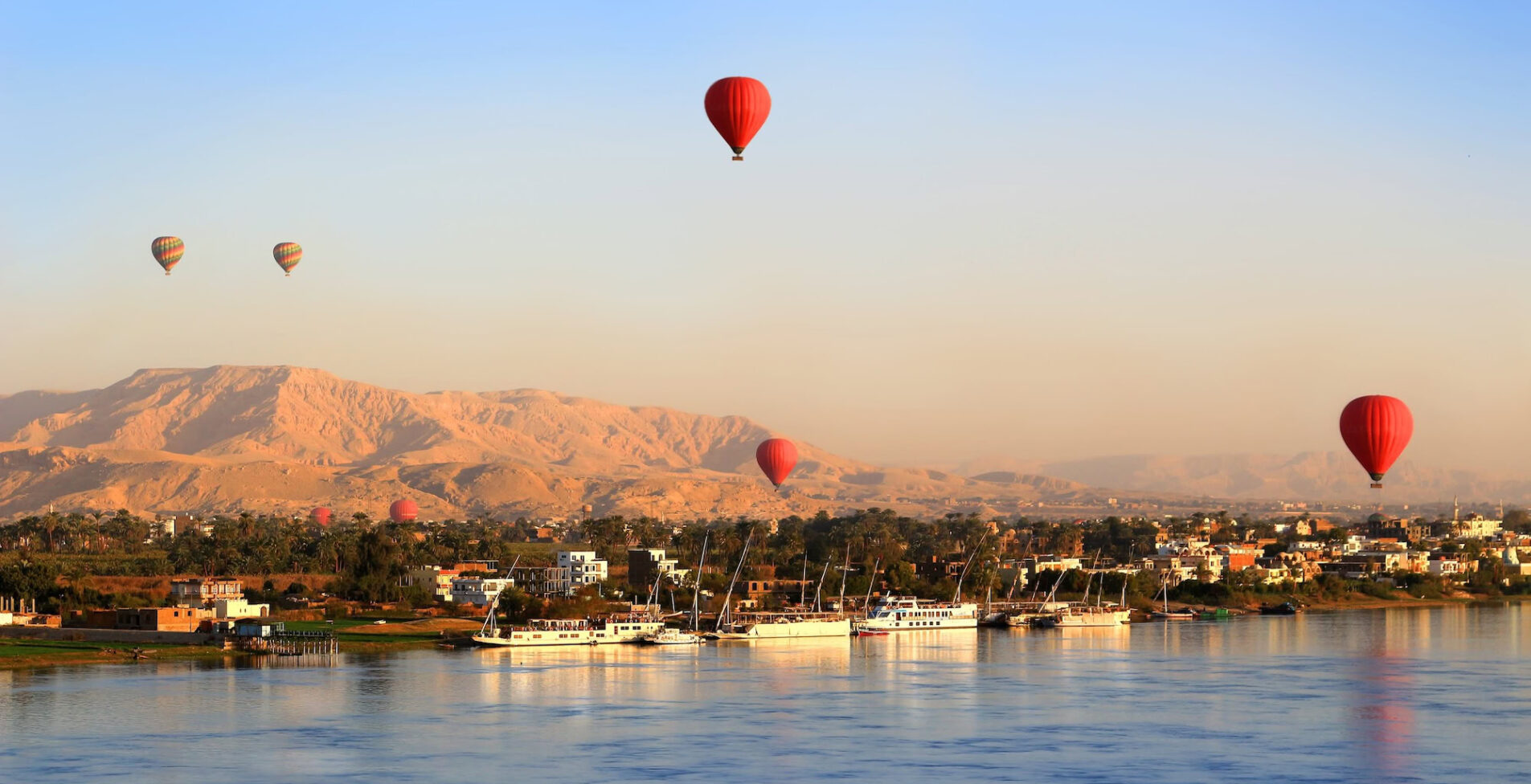 Hot air balloons floating over the Nile River in Luxor at sunrise 1