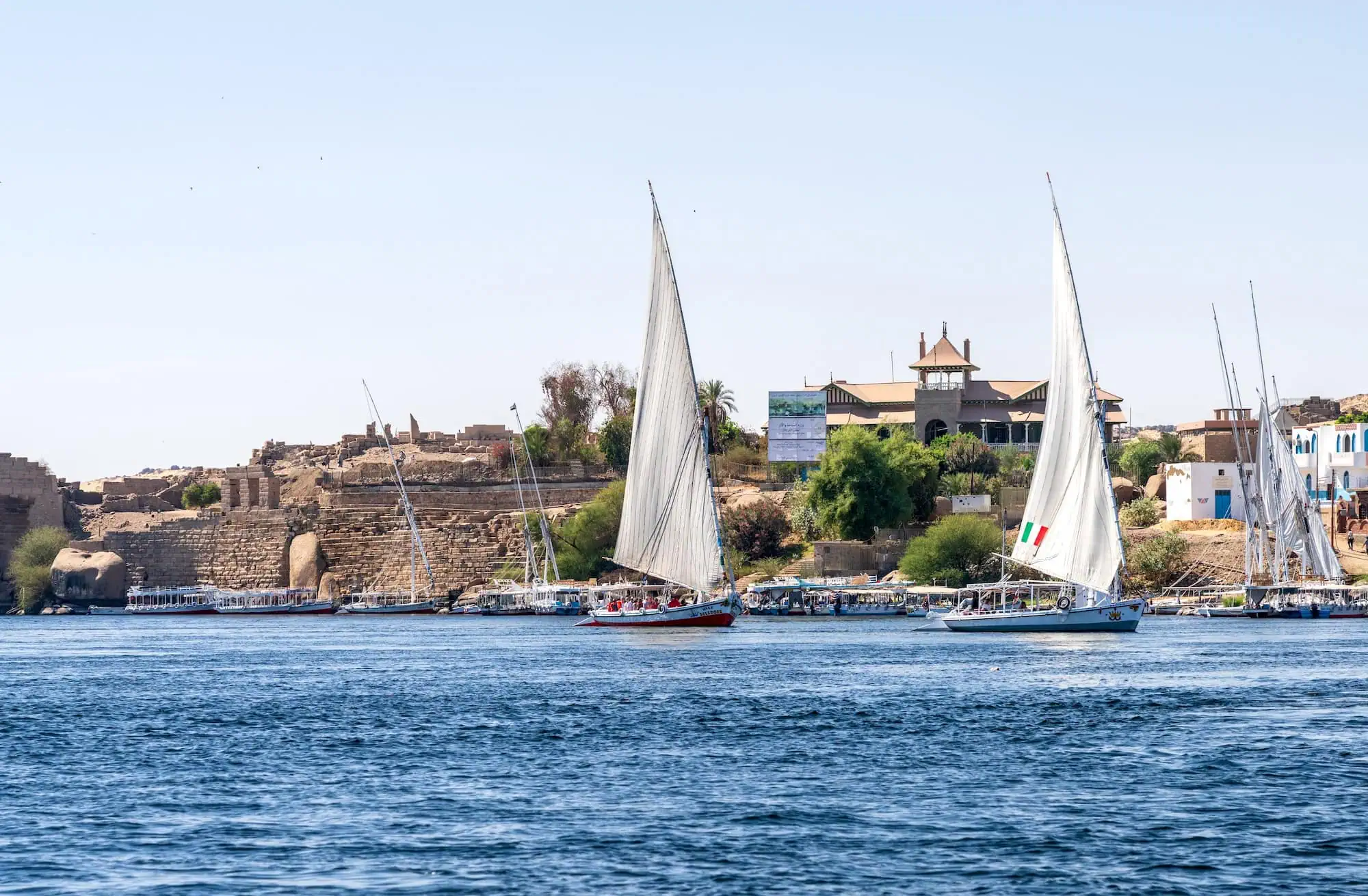 Afternoon view of the Nile with feluccas and boats near Elephantine Island Museum