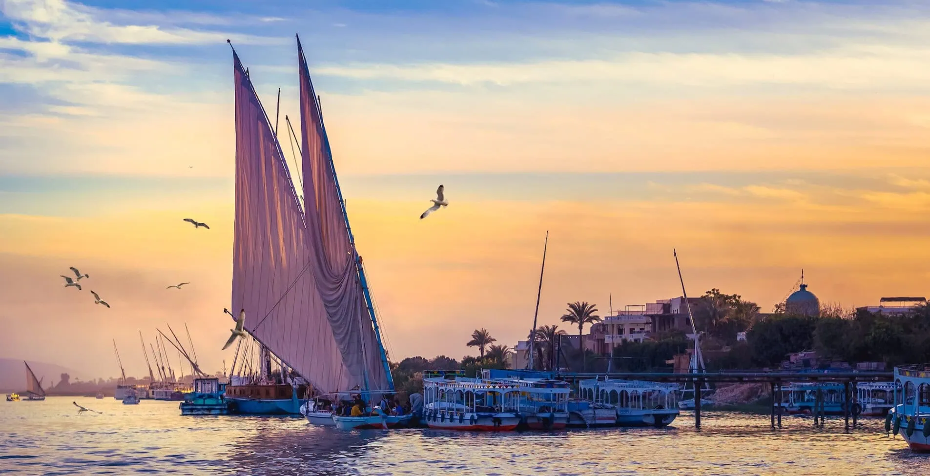 Felucca at sunset voyage on sail vessel on the Nile river romantic cruise and adventures in Egypt