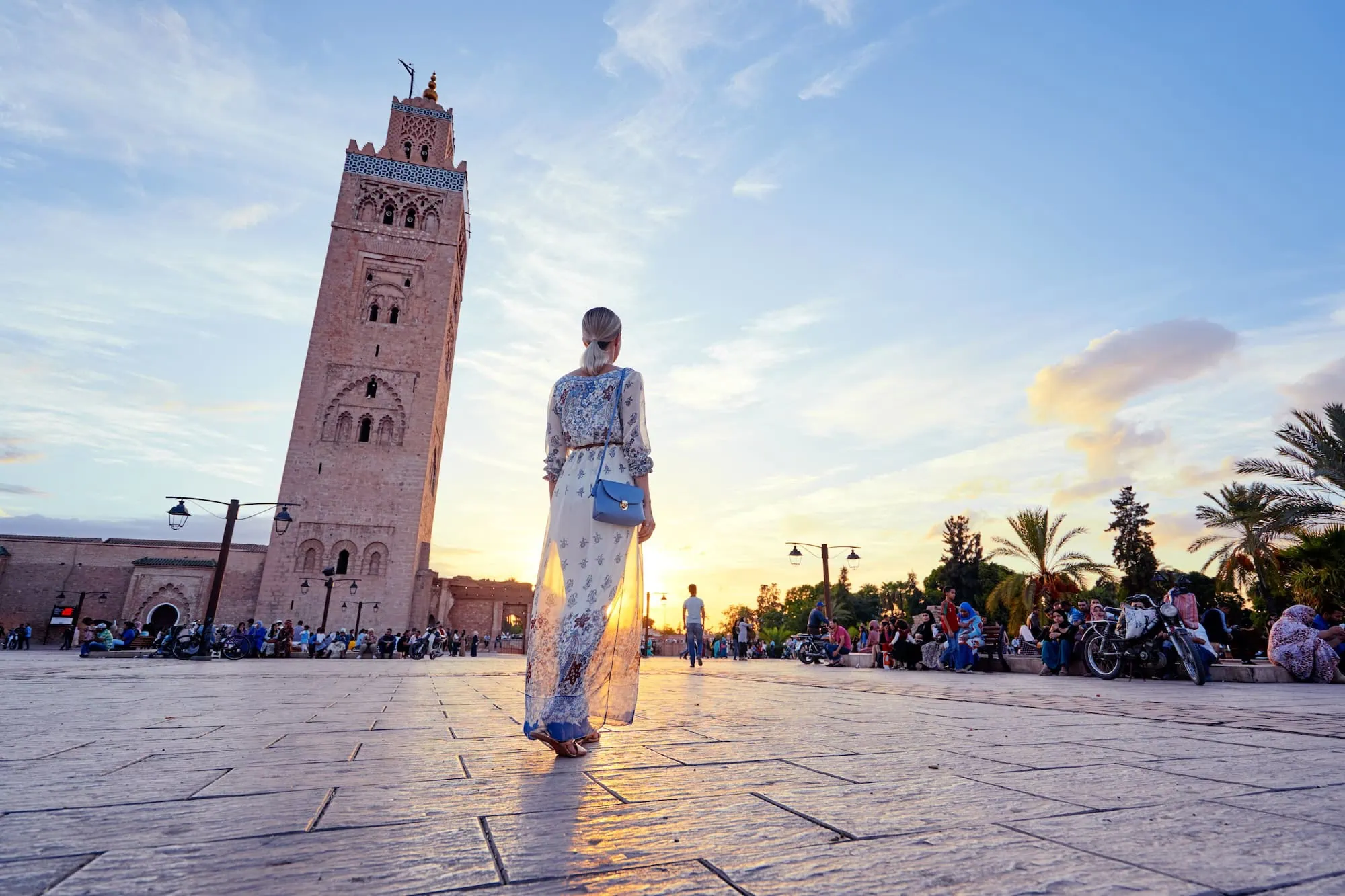 Panoramic view of Jemaa el-Fna square at dusk with Koutoubia Mosque minaret