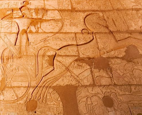 In circa 1275 BC, Ramses II led the Egyptian army into battle against the Hittites in the city of Qadesh, an important trading town in Syria. Many historians assert that the result of the battle was inconclusive. Ramses however declared victory, presenting the image of a victorious army leader in most the temples he constructed all around Egypt. Ramses II was drawn firing arrows at the fleeing Hittites, and he was also represented as a man of great strength, holding his enemies from the head.